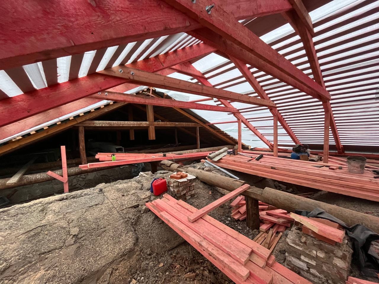 Пока рабочие подрядчика из Вологды демонтировали часть кровли и устанавливают новую стропильную систему и обрешетку. Окончание работ запланировано на 1 мая 2026 года.