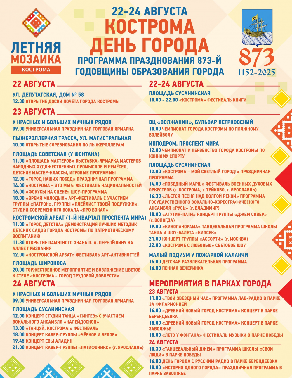 Праздновать 873-летие Костромы будут 23 и 24 августа — сообщает администрация города. Чиновники опубликовали главные события праздника.