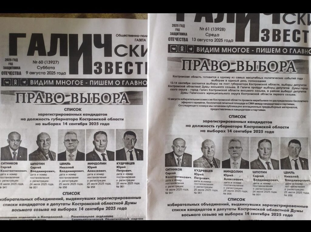 Газета «Галичские известия» в Костромской области опубликовала номер, где все кандидаты в губернаторы кроме действующего главы региона Сергея Ситникова были перепутаны местами – сообщает телеграм-канал «Костромать». ФИО абсолютно всех участников выборов не совпали с их фотографиями.