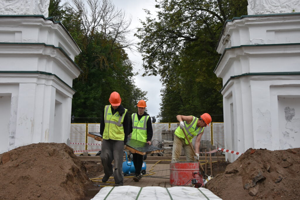Исполнителем выступает ЗАО «Сафоновский промкомбинат». Подрядчик уже успел усилить фундамент входа, очистить кладку колонн и чугунные элементы от многочисленных слоев краски. Декоративные элементы взамен утраченных воссоздадут на заказ. В дальнейшем у колонн поставят водоотвод, чтобы влага не разрушала конструкции изнутри.