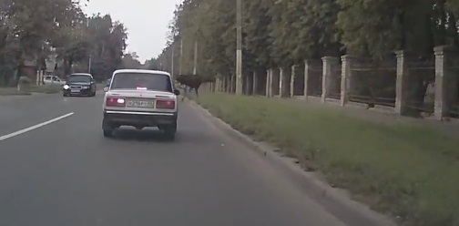 Сохатый перебежал дорогу с оживленным движением и врезался в забор.