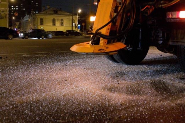 В связи с установлением низких температур идет обработка региональных дорог противогололедными средствами.